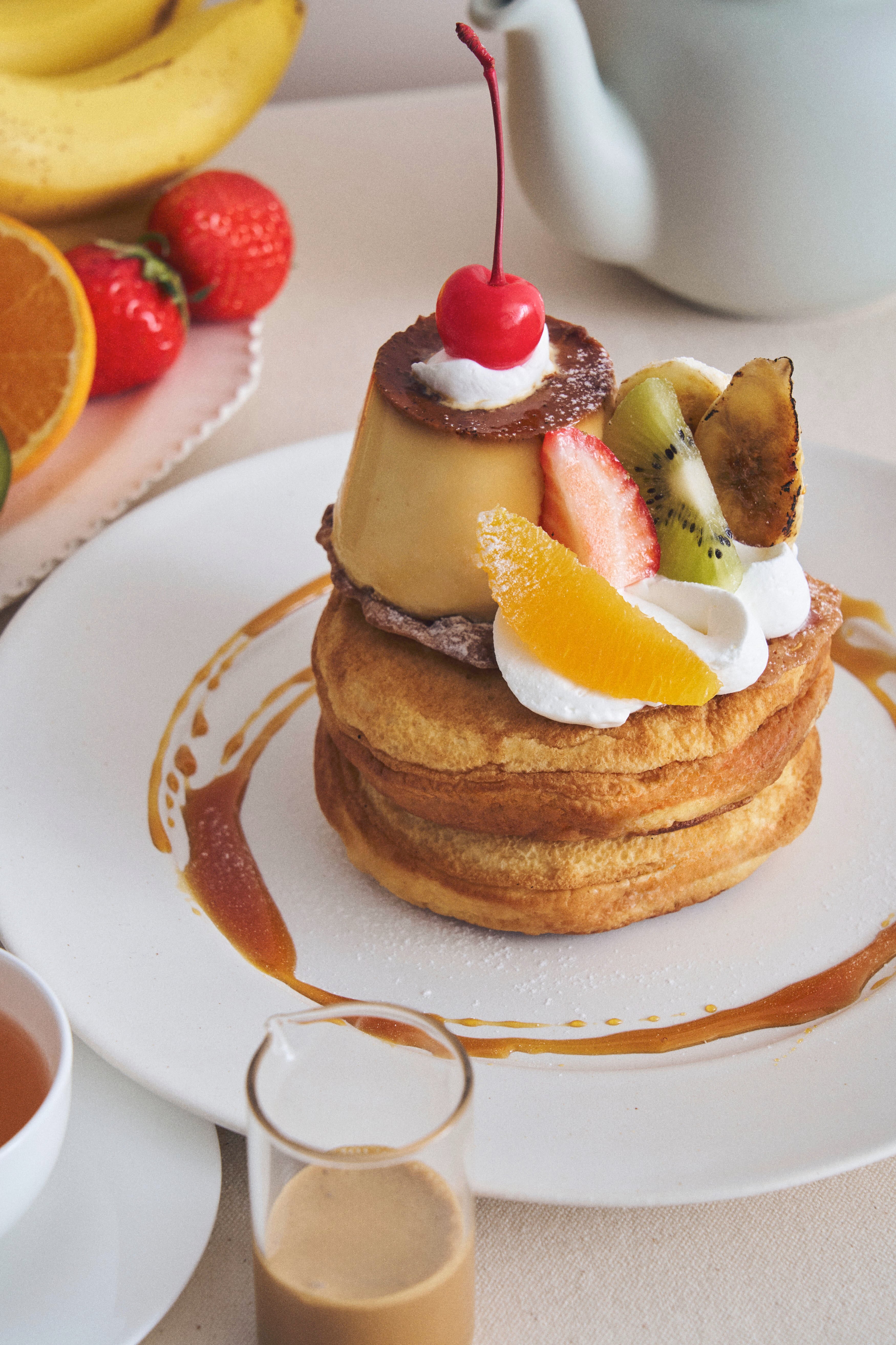・プリンアラモードパンケーキ 黒糖ミルクティーキャラメルソース